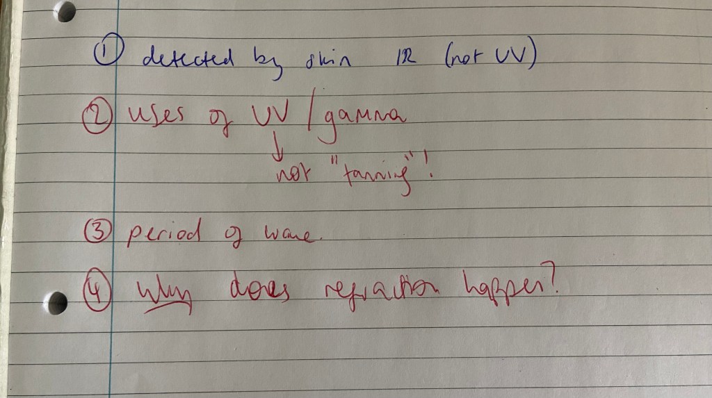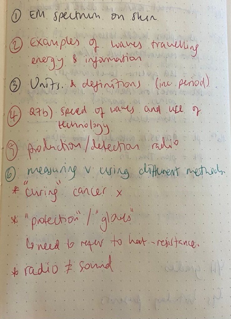 - Give three targets (literally two or three numbers, circled), and display the corresponding tasks on the board when feeding back to students. They identify their weaker areas (and their strengths, too), and work on those. This is my preferred method because it saves me time, but students all get targets and feedback from me that is personal to them. The picture below shows an example of some points I wrote down whilst marking some Year 10 papers about Waves and the EM spectrum.