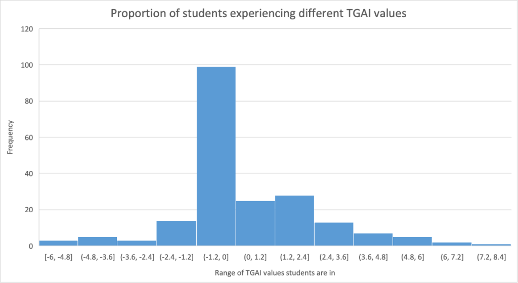 The graph highlights the large portion of students with negative TGAI values. However, there is a second (much smaller) peak at TGAI=(1.2, 2.4], indicating that some pupils feel they need to meet (if not exceed) their target grades.