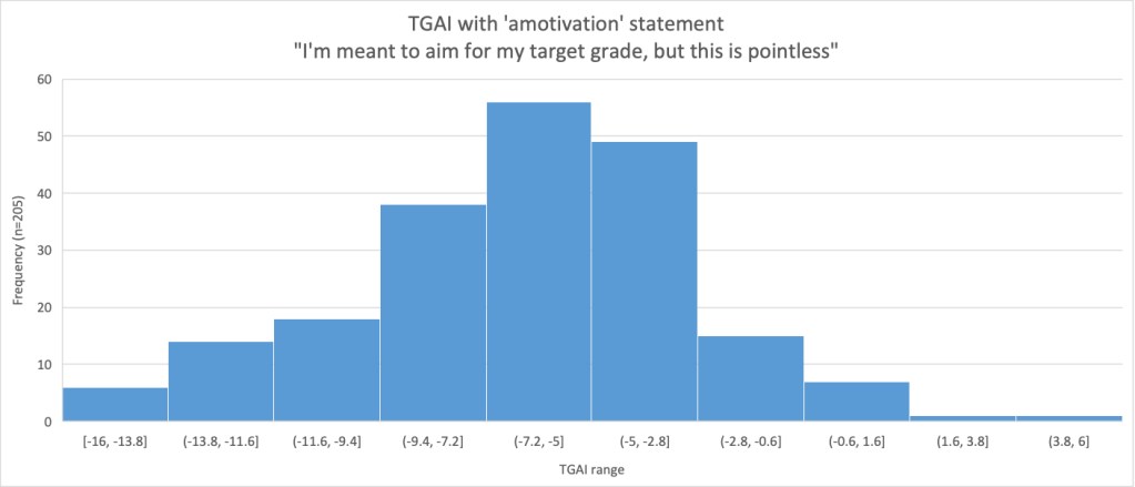 Whilst the graph above does not include the ‘amotivation’ score, its inclusion did significantly affect the TGAI values (as can be seen from the first TGAI correlation graph above). This next graph details the number of students whose TGAI was brought down significantly by the indication that students view target grades as pointless.
